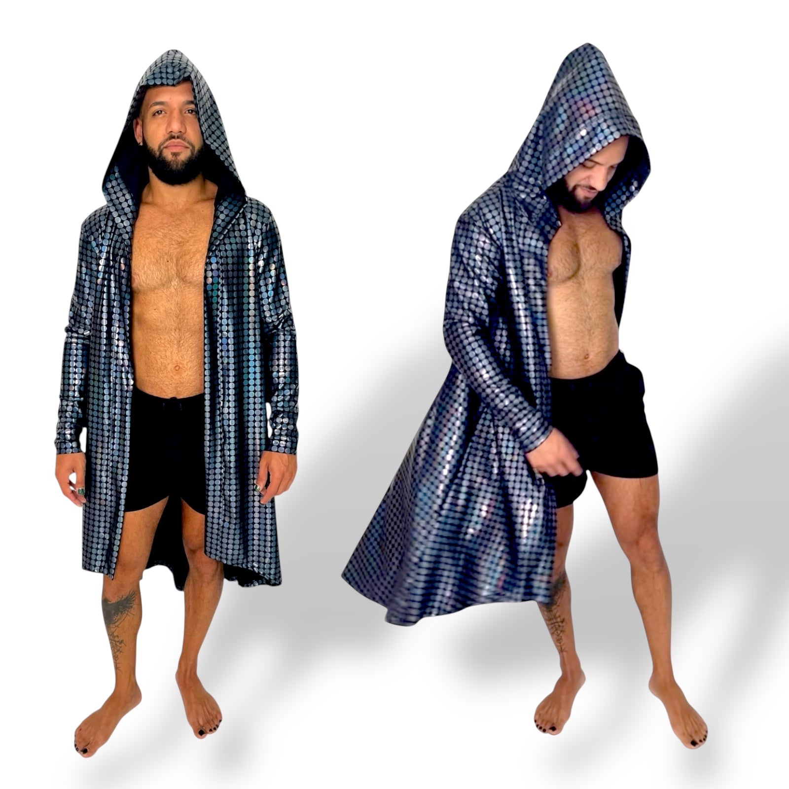 When we make a cape, we make is dramatic! This holographic dot fabric is the perfect weight for this cape. Higher in the front and lower in the back and extra room at the back to really get some dramatic swing action. Made to drape open in the front, with a facing that goes all along the front to help keep the shape. Truly a showpiece, Fabric is stretch.