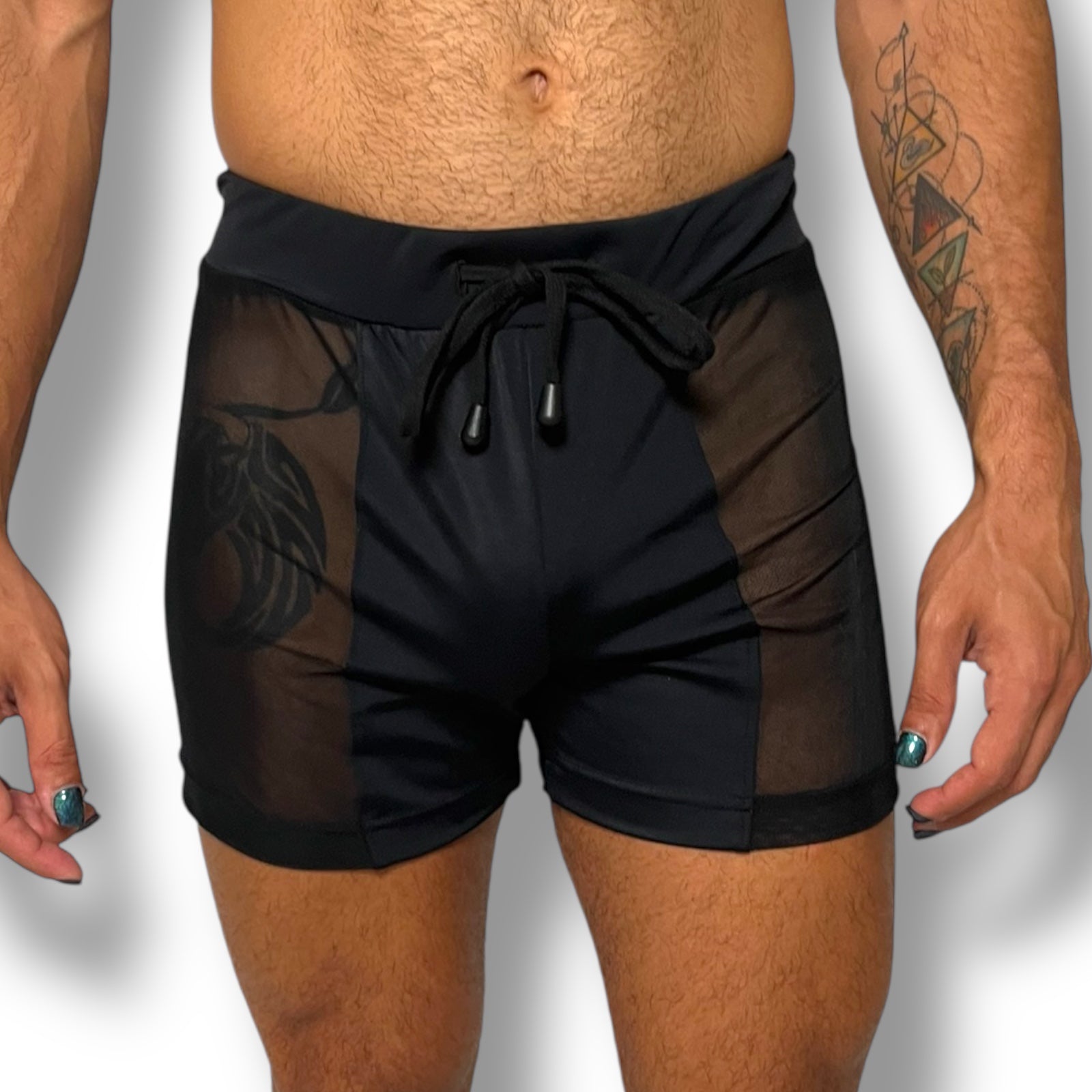 Of course i'm wearing bottoms! As naked as you can legally get in public. These side mesh shorts are sure to get some attention. Cotton drawstring and end stops for an elevated look complete this one of a kind short. Lycra solid panels and sheer power mesh side panels.
