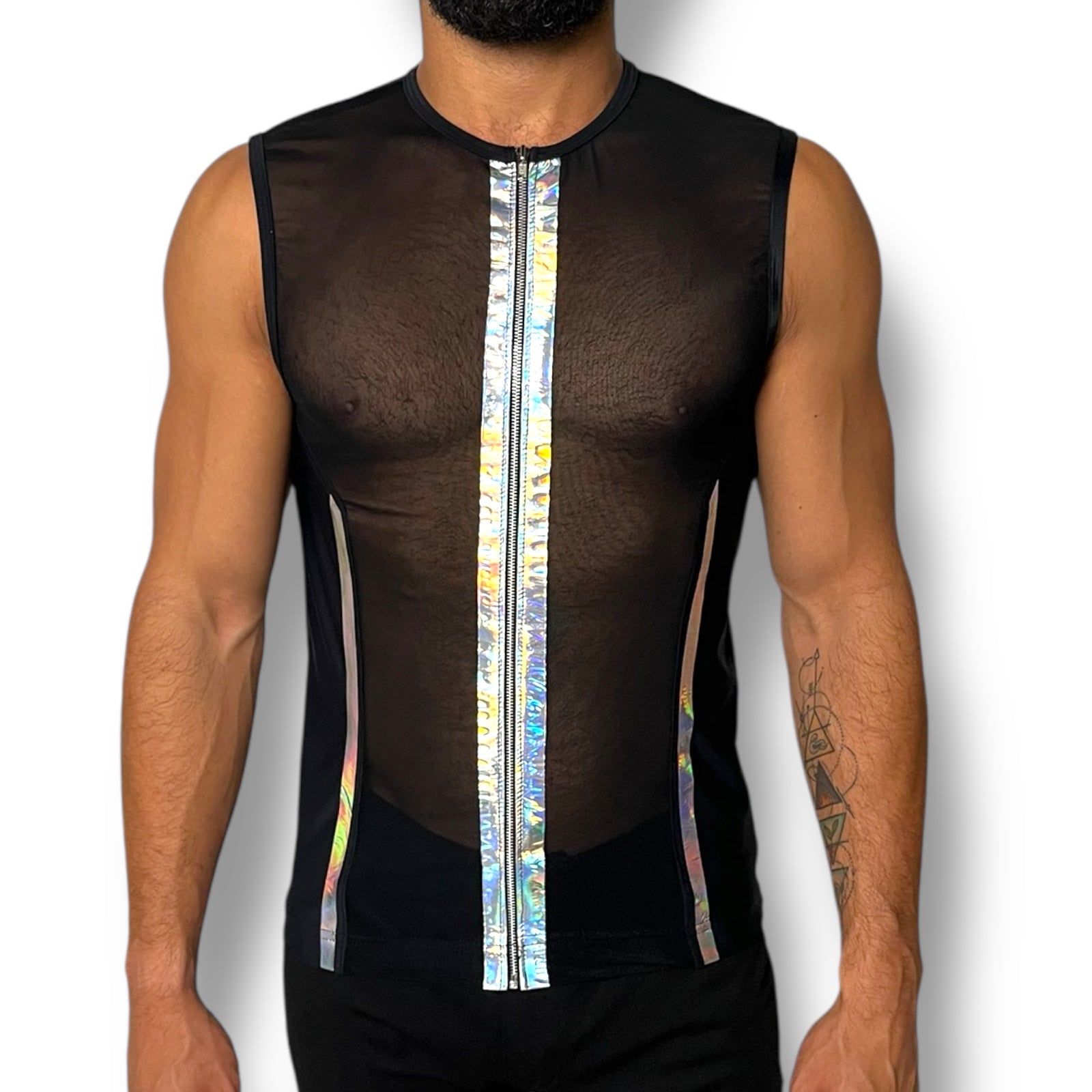 Holographic Space Stripe Mesh Stretch Zip Tank
